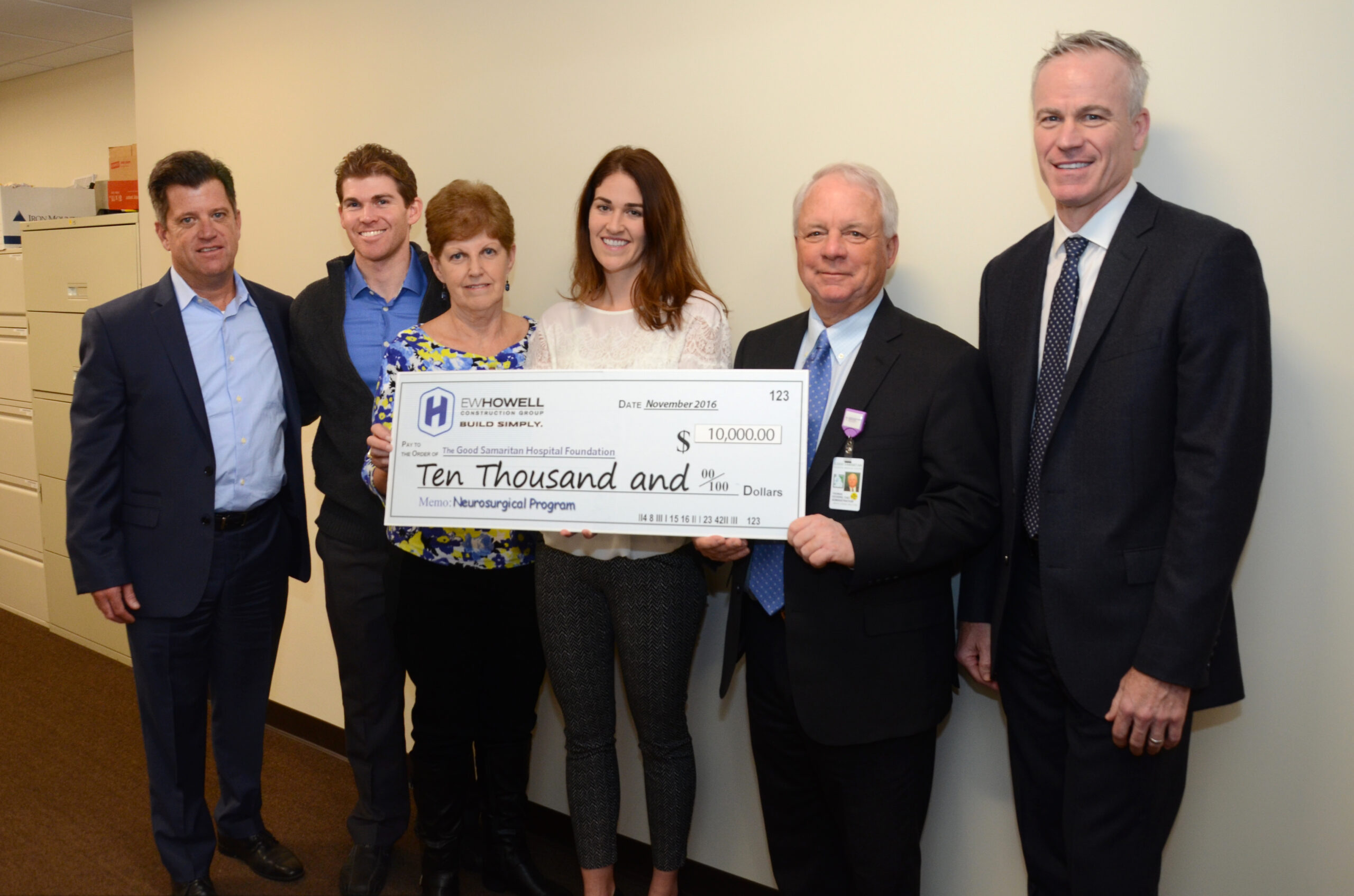 Members of The John Bergin Benefit for a Friend presented a $10,000 donation to the Good Samaritan’s Neurosurgical Program on November 15, 2016 in memory of John Bergin. John was a Senior Vice President at E.W. Howell Construction Group and one of the founding members of the Benefit for a Friend, a charitable organization sponsored by E.W. Howell that helps local families in need. Mr. Bergin received treatment at Good Samaritan Hospital earlier this year before his death in May 2016. His family – son Bryan Bergin, wife Rosemary Bergin and daughter Lauren Bergin-Novellano — was also in attendance to present the donation.