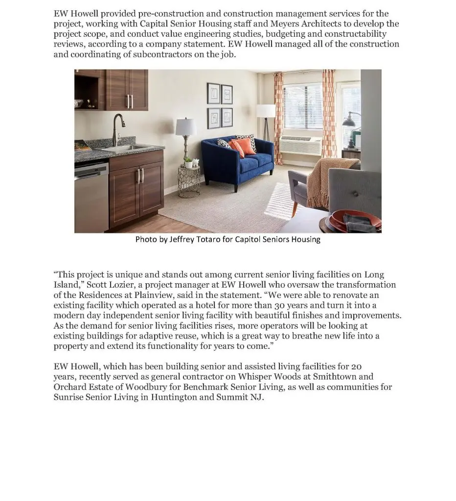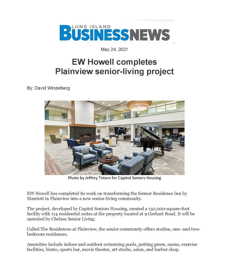 FEATURED IN LONG ISLAND BUSINESS NEWS: EW HOWELL COMPLETES PLAINVIEW SENIOR-LIVING PROJECT