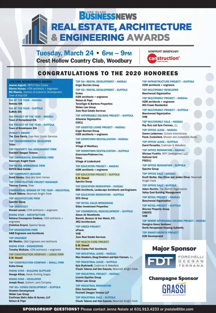 EW Howell is being recognized in the following categories at the 2020 Long Island Business News Real Estate, Architecture & Engineering Awards: Top Construction Company – Large Firm | Top Education Project – Stony Brook University Student Services Center | Top Healthcare Project – Stony Brook Children’s Hospital