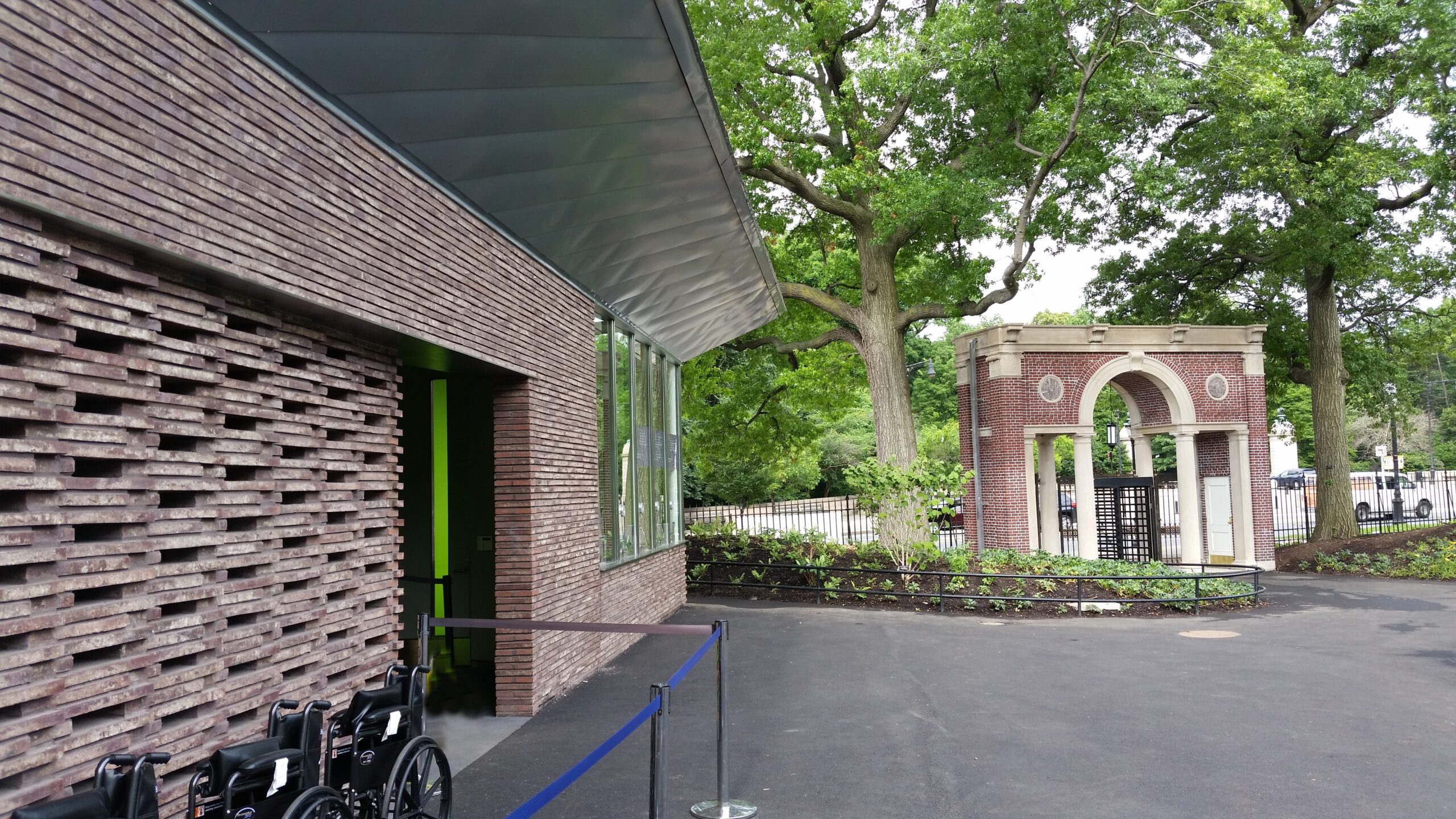 The make up of the new entry building includes a brick exterior manufactured in Holland, a zinc panel roof and German glass windows made of bird-protection glass.