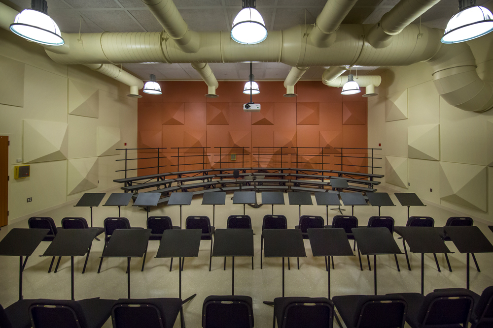 Designed by Pfeiffer Partners, the addition includes performance and rehearsal spaces for the music and theater departments.