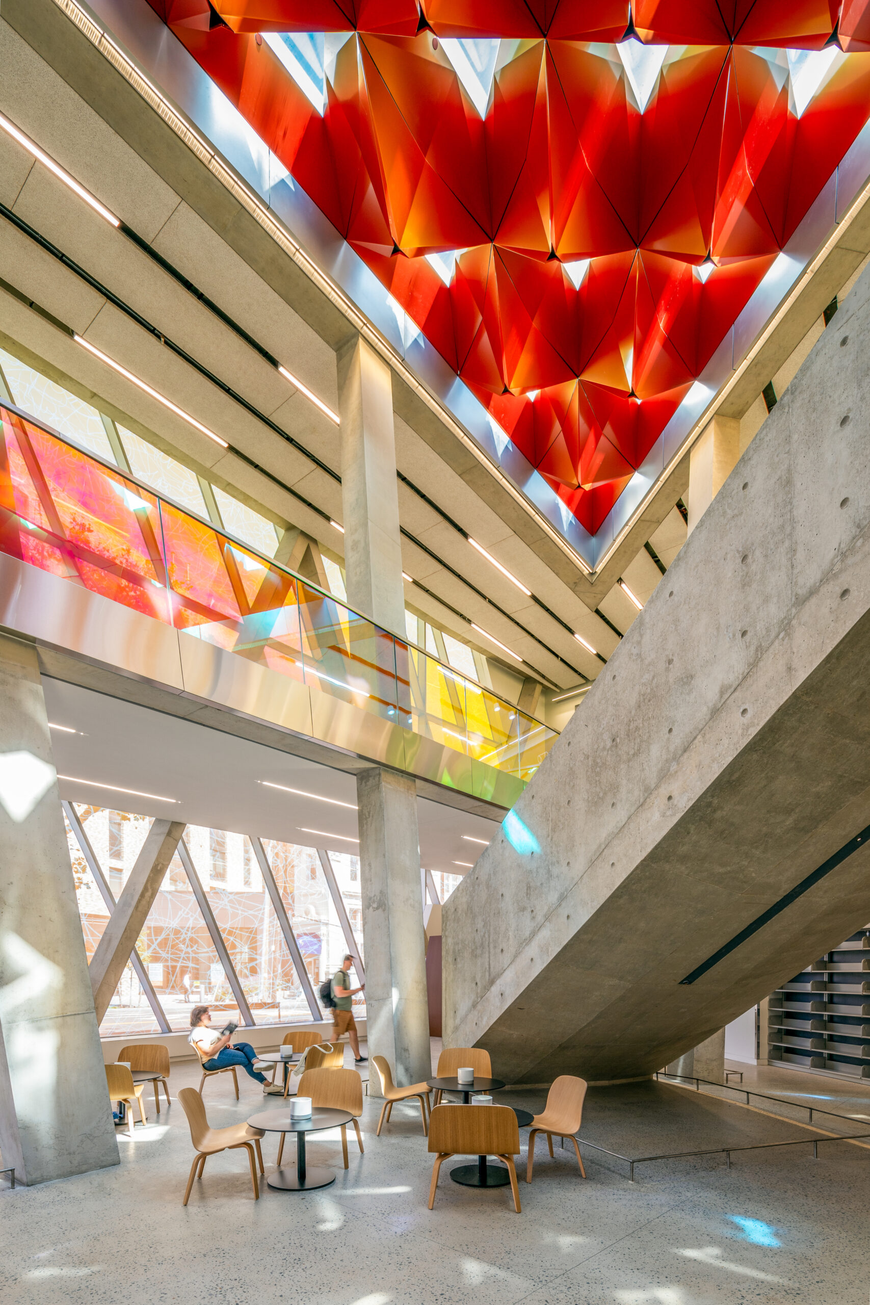 At the building’s center is a large triangular open atrium beneath a large triangular skylight with a complex hung tetrahedron baffle system to diffuse the light.