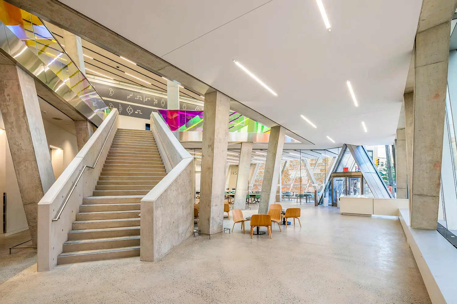 Other notable design elements include the Tectum wood fiber ceiling panels and seamless acoustic plaster for sound absorption; the main staircase formed in architectural concrete is a complex geometric shape with integral lighting; floor to ceiling glass partitions on the first floor; upturned roof beams to provide an uninterrupted ceiling plane of the main library space; a canted dichroic glass railing system which surrounds the interior atrium opening; and an energy code compliant ‘blue’ roof designed to release storm water from the site slowly; and a gabion basket rock wall which encloses the exterior courtyard.