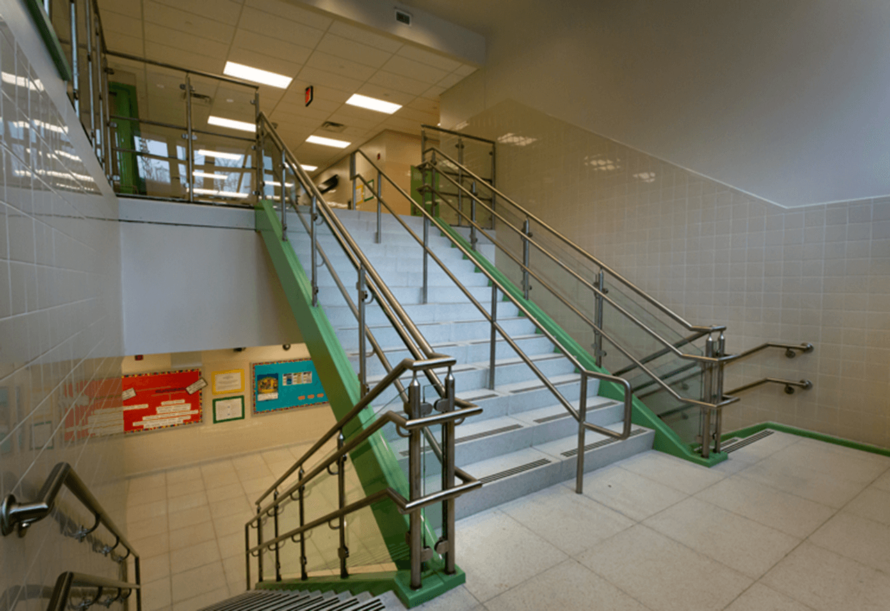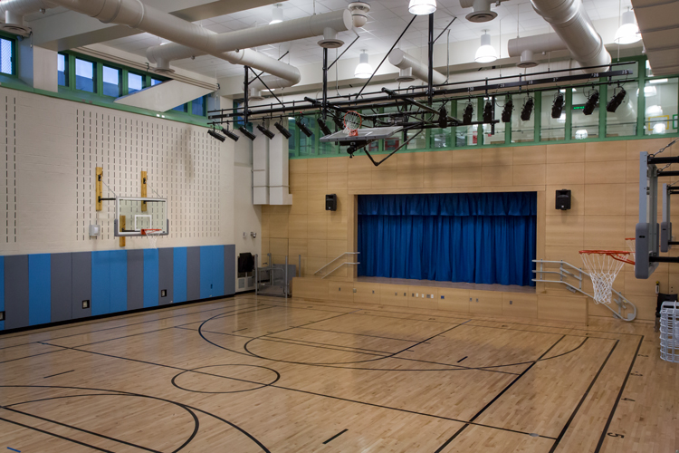 The design scheme features a walkway extending from the street to the main building entrance, located within the interior of the site and giving the school will a campus-like ambiance. A grand architectural stairway leads from the ground floor to a basement-level gymatorium, which is visible upon entry into the main lobby via glass wall panels.