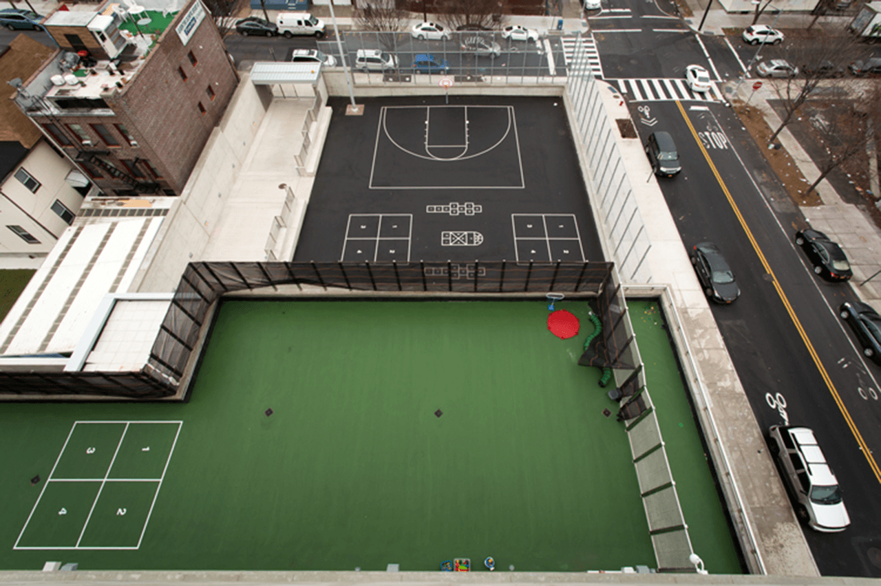 The site of the new PS 339 school is on the edge of a residential neighborhood of predominately two-four story apartment buildings, some single-family residences, and light manufacturing facilities. An elevated railroad corridor and bridge to the north and east of the site generates noise and creates vibration concerns for the site due to its close proximity. High-performance materials, technology, and specialized foundation systems are employed to mitigate those conditions.