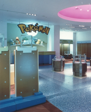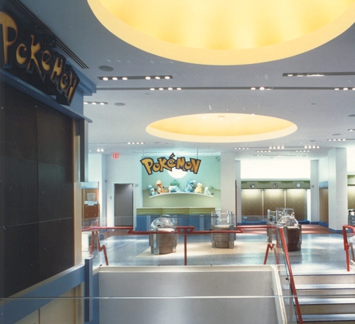 Completed in November 2001, this 13,000-square-foot Pokemon Center flagship retail center encompasses two levels at the corner of Rockefeller Center and 48th Street (now occupied by the Nintendo World store). The Pokemon Center was designed by The Phillips Group, who were tasked with blending a 21st century store into a 1937 landmark building. The space includes the ground floor, a mezzanine, and a lower level used for storage. The two retail floors are connected by a glass-enclosed elevator in addition to a staircase. The store is encased on two sides with glass, eliminating the need for any exterior signage.