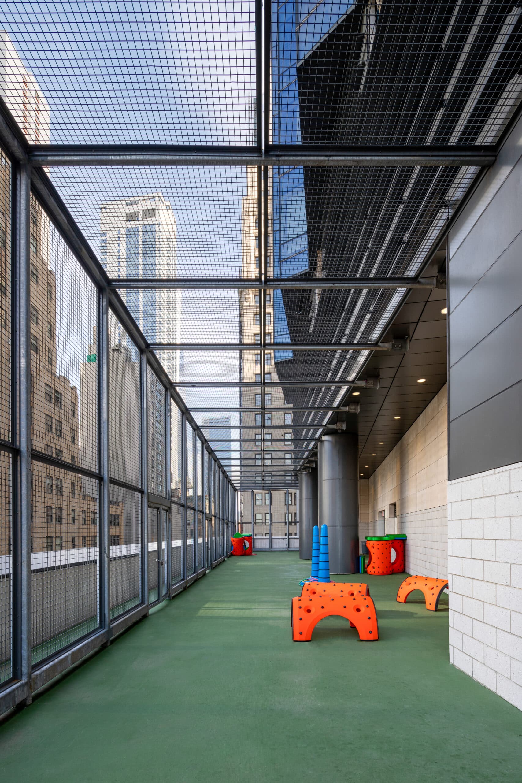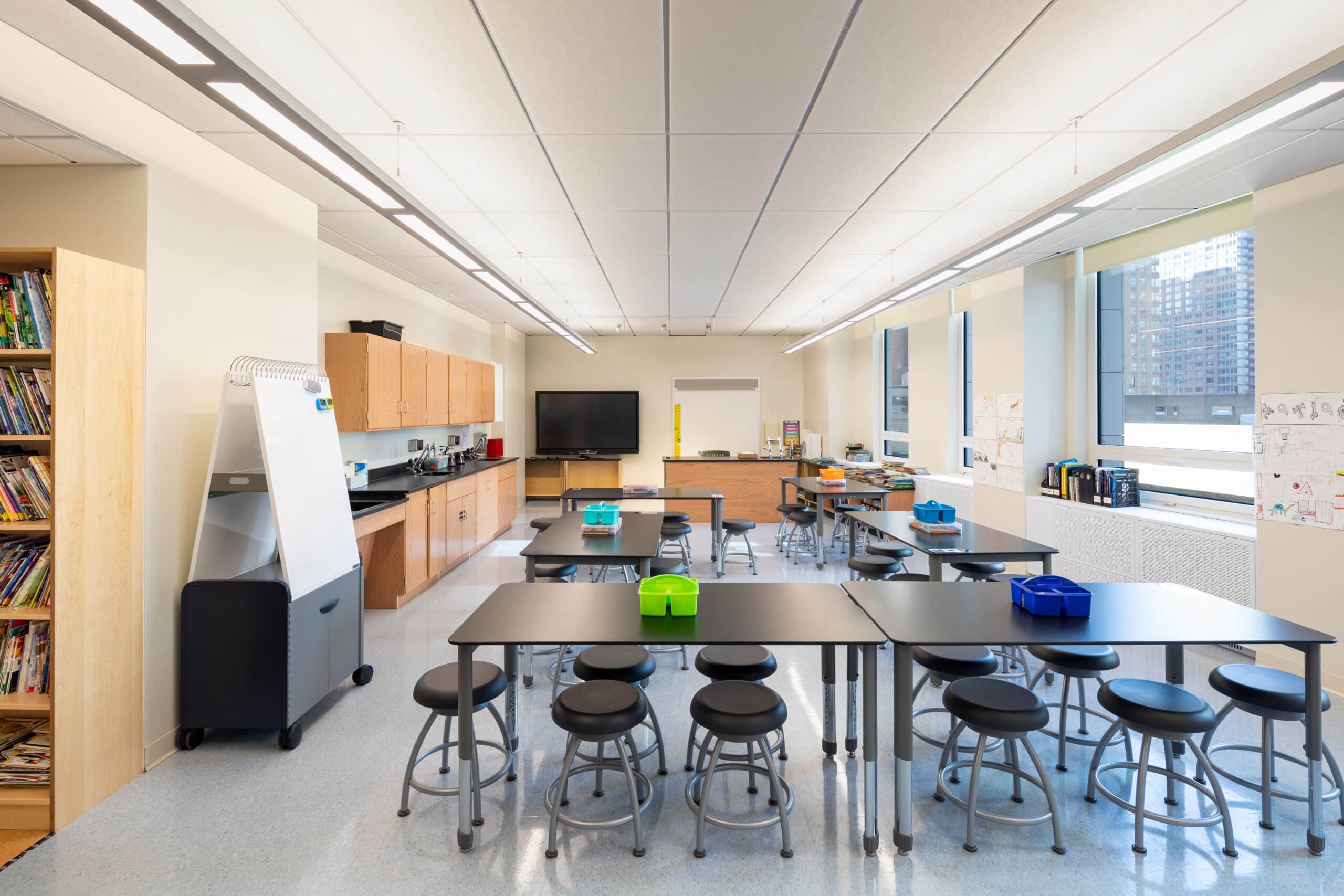 The school includes new classrooms, a gymnasium, a cafeteria, a library, a multipurpose room, 2 passenger elevators, and a rooftop play area. Additionally, the space hosts administrative offices and 2 outdoor playgrounds. The south wing takes up 4 stories in a renovated historical building, the Robert and Anne Dickey House, which was build in 1810.