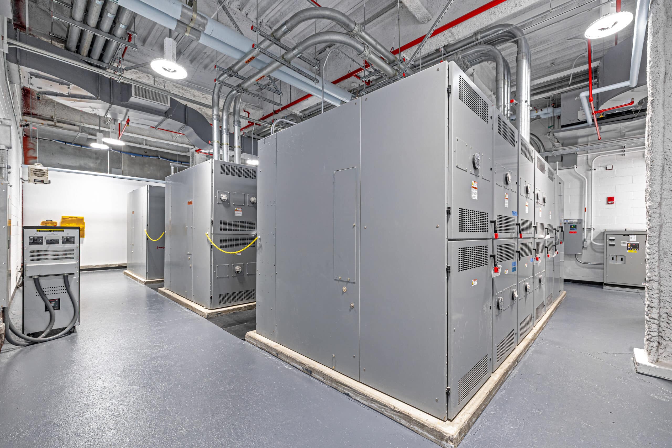 Chilled water is provided to the hospital through underground double-walled piping connecting to their existing utility tunnel. The steam plant features a SCADA system, 3 new steam boilers, 3 underground 35,000-gallon fuel oil storage tanks, and transfer systems, a deaerator with boiler feed water pumps, a surge tank, and condensate transfer pumps. Within the CUP is a facility control room with SCADA and BMS workstations. Two new passenger elevators will serve a future parking garage connected to the CUP lobbies. Electrical system upgrades include 2 new 3900kW emergency generators with load bank, 3 new 5kV utility switchgear, normal substation, paralleling gear, transformers, redundant battery rooms, and 3 capacitor banks. The ENI portion of the project replaces the existing electrical switch yard with 2 new prefabricated buildings containing normal and emergency double-ended substations, and a separate ATS building.