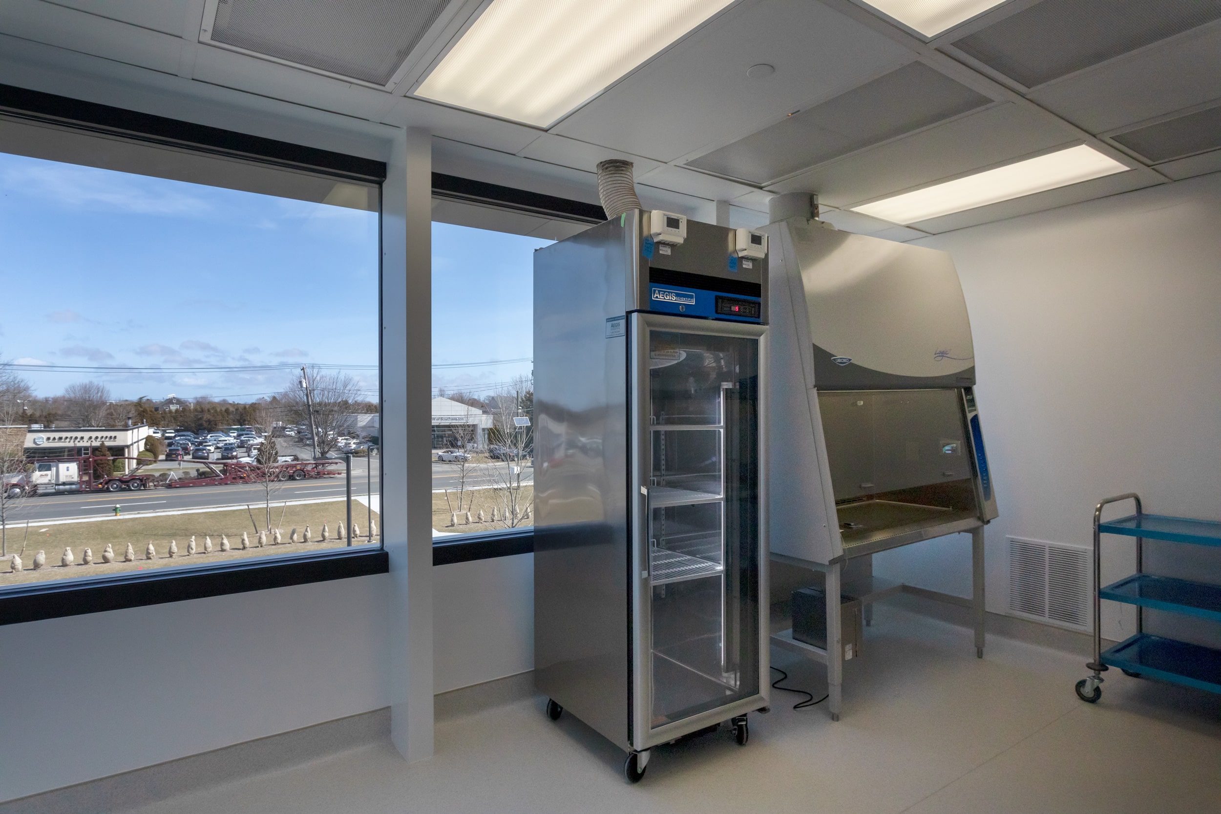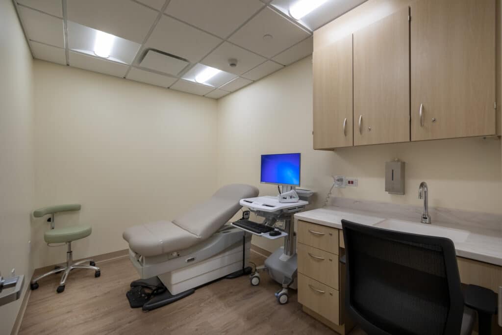 The Center boasts a primary patient treatment room highlighted by raised cathedral ceilings and expansive windows and skylights to allow views out of both to an adjacent garden.