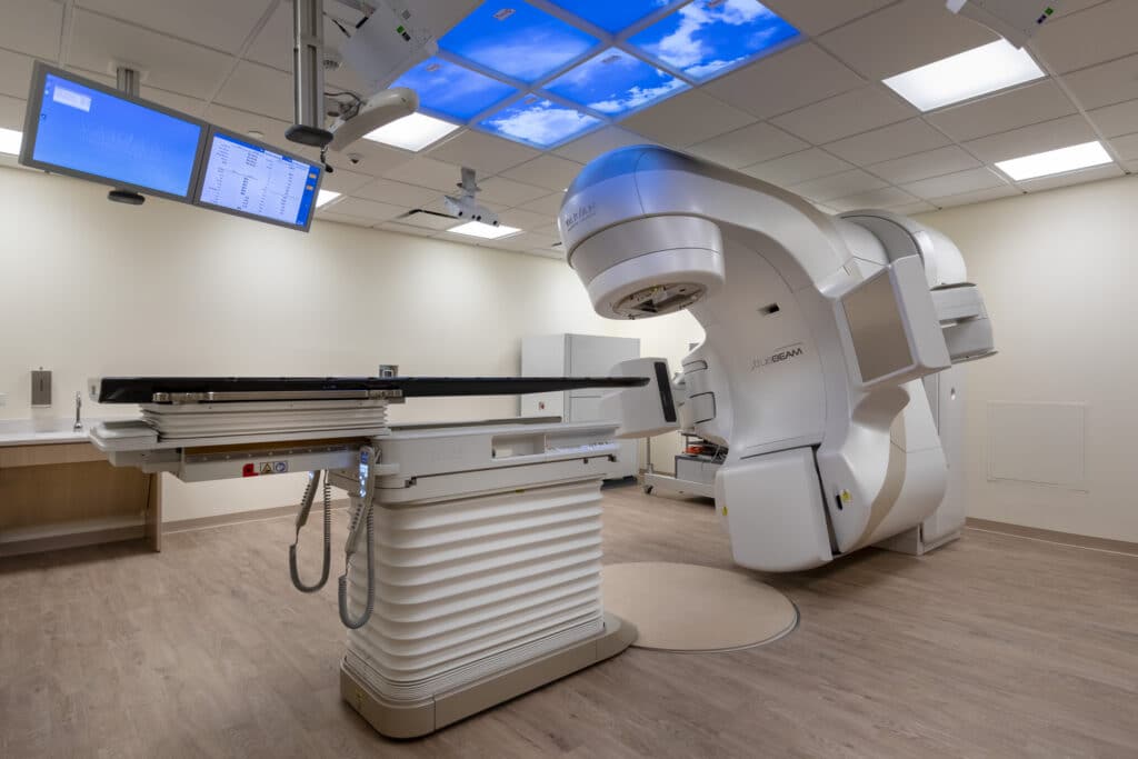 At the center of the building’s planning was the installation of a state-of-the-art linear accelerator. To accommodate the technology, the project team located the radiation treatment area on the ground floor, incorporating a 22,000-pound leaded cantilevered concrete door and prefabricated leaded concrete walls in the vault.