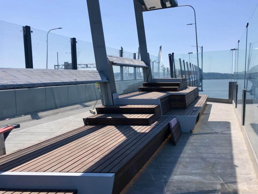 The belvederes each have a unique theme and name—Fish and Ships, Painter’s Point, River Crossing, Half Moon, Tides of Tarrytown, and Palisades—illustrated by different design concepts, which required the construction of one-of-a-kind sculpted seating areas of stainless steel, glass, granite and wood. EW Howell worked with specialty engineers and the project architect, HDR, to develop final designs for the glass parapet enclosure, to provide unobstructed views from each belvedere. This was a challenge due to the strict tolerances of the bridge, wind load requirements, and bridge deck curved contour profiles.